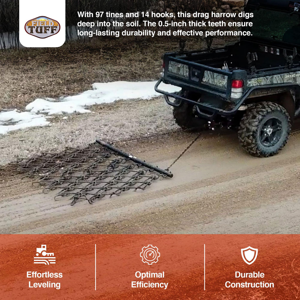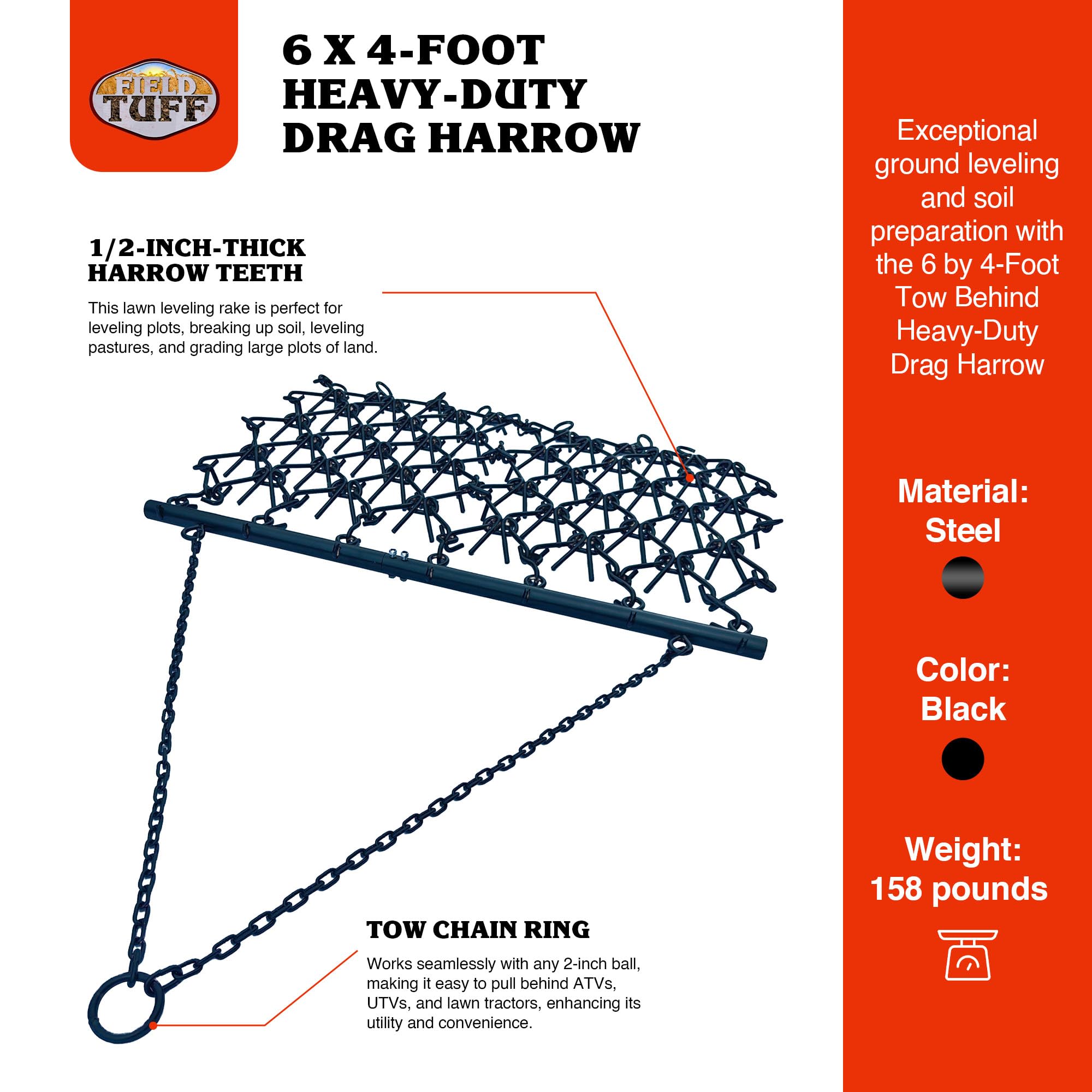 Tow-Behind Attachment: Measuring 6 feet by 4 feet, this drag harrow delivers a wide working width that lets you cover large areas quickly and with fewer passes.