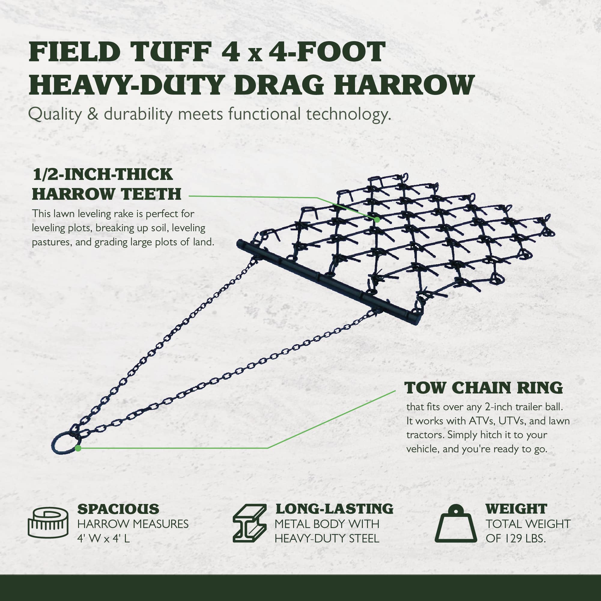 Get serious about land maintenance with the Field Tuff Heavy-Duty Drag Harrow. Built for rugged use, this tool handles a variety of field and yard tasks.