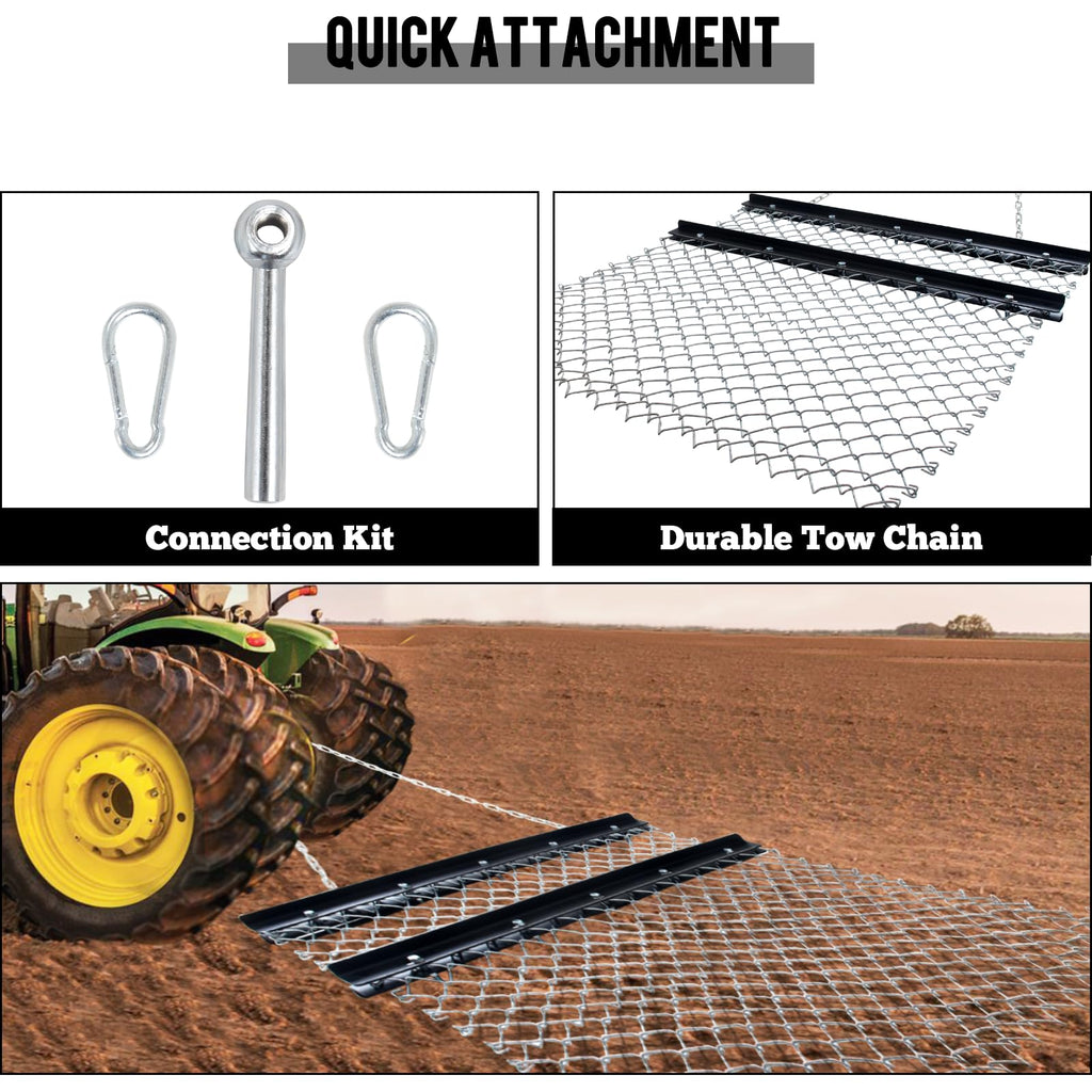 Convenient Design: Features a heavy-duty chain and carabiner for simple attachment to ATVs, UTVs, and utility tractors - easily disassembled and rolled up for compact storage