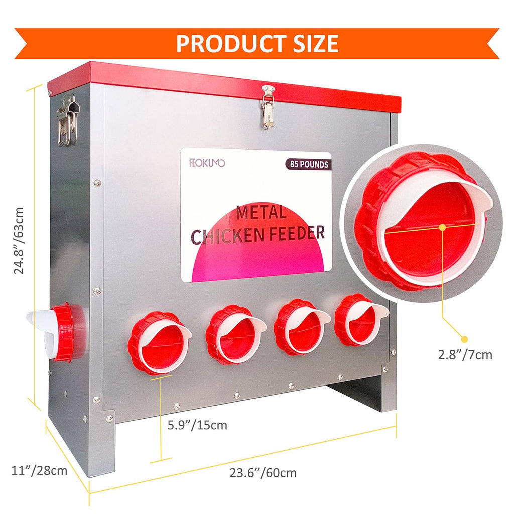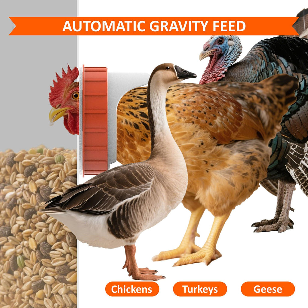 The Feokumo Automatic Metal Poultry Feeder delivers long-term feeding with minimal effort—ideal for busy schedules, extended travel, or large flocks. Built to reduce waste, withstand the elements, and keep your flock healthy.
