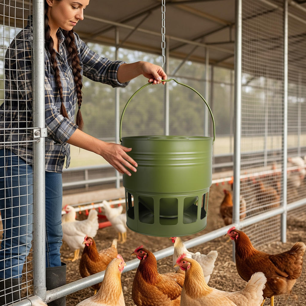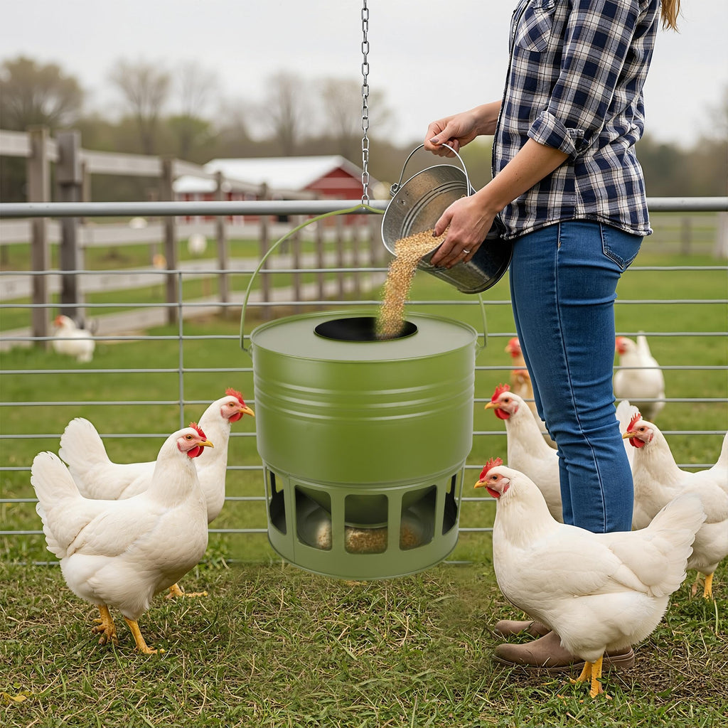 The Kol 20lb Metal Hanging Chicken Feeder offers clean, efficient feeding for backyard flocks of all sizes. Its adjustable hanging design supports versatility, hygiene, and durability.