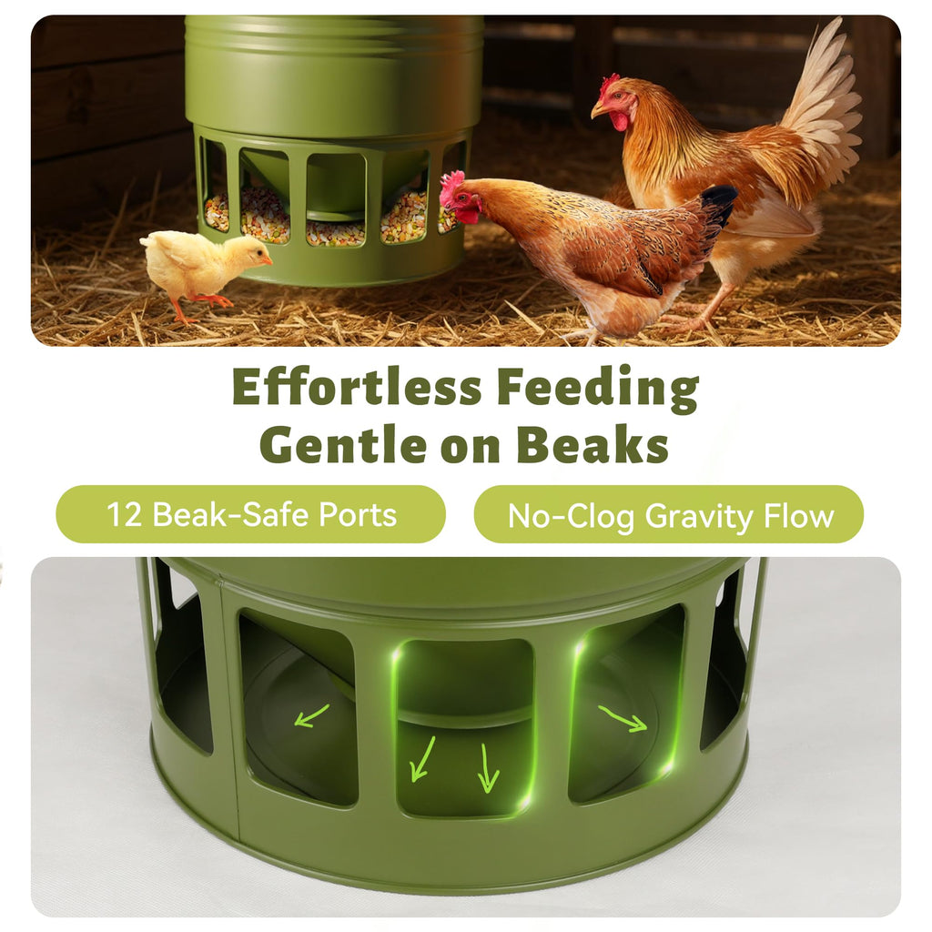 Smooth, Spill-Proof Feeding for All Sizes: With 12 rounded feeding ports and a gravity-driven flow, chickens enjoy continuous access to clean feed. Smooth edges protect beaks and minimize feed loss, while the elevated position keeps food off the ground.