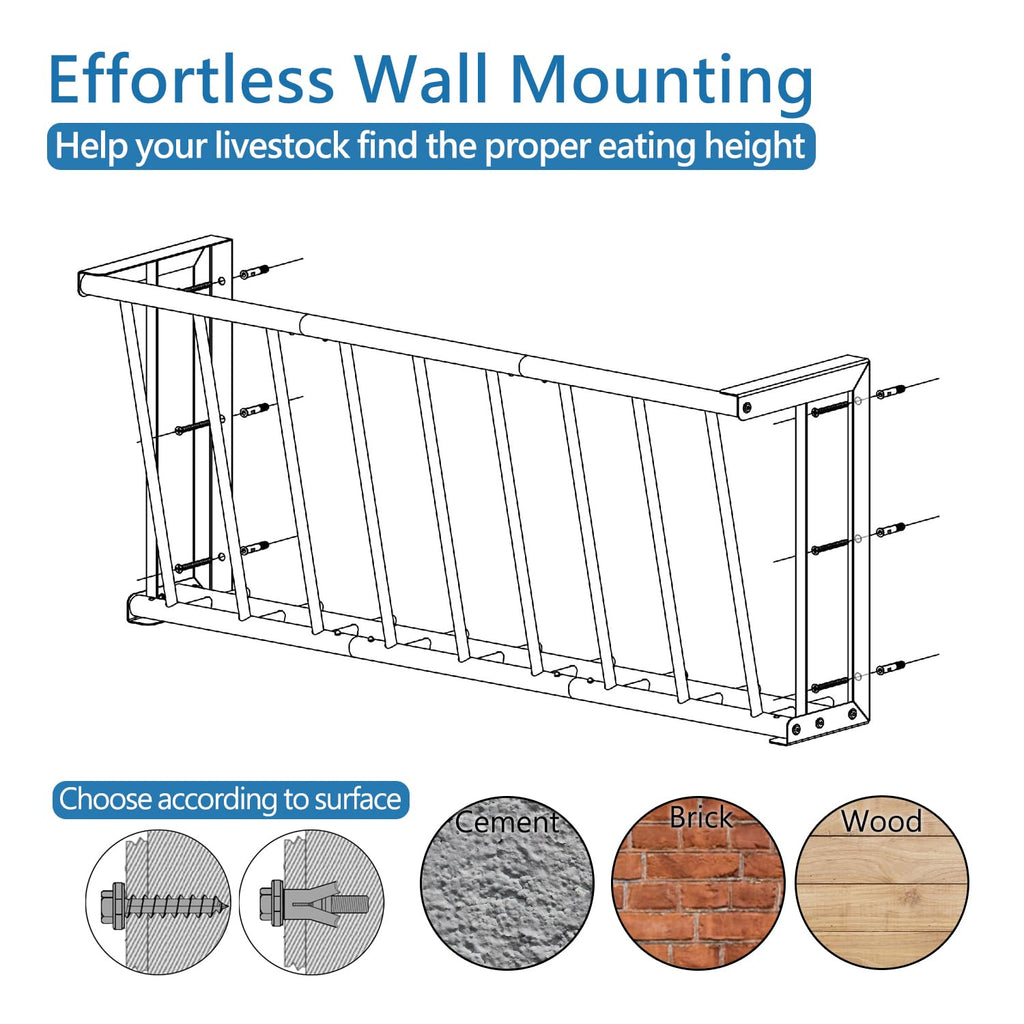 - Premium Material: Constructed of durable carbon steel, our wall hay rack can be used for years to come. It is rust-proof, non-deformed and BPA-free, being friendly to animals' healthy growth.