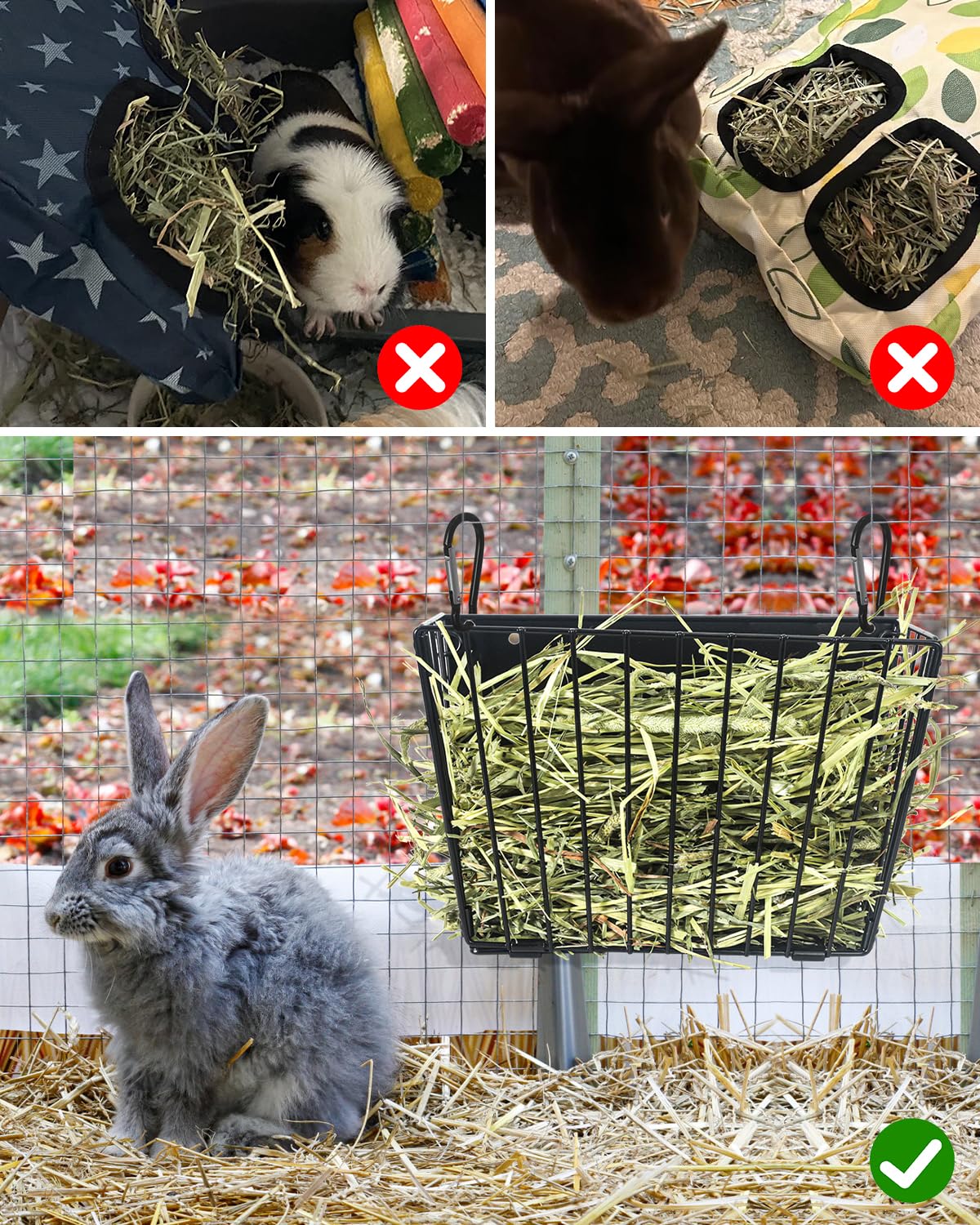The Harhana Metal Frame Hay Feeder is designed for rabbits, guinea pigs, and other small animals that need consistent access to fresh hay without the mess. It's thoughtfully built for durability, function, and comfort.