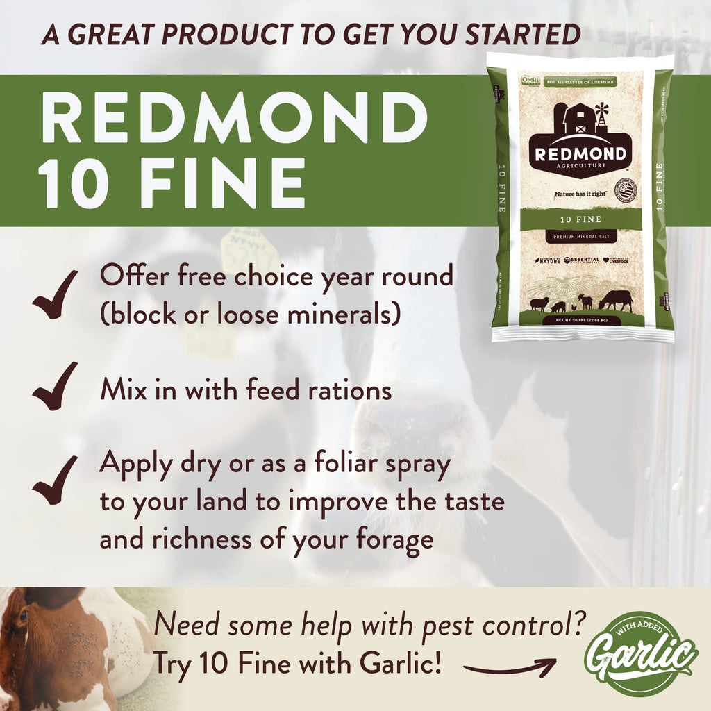 Start with a mineral salt your animals will actually eat - and benefit from. Redmond 10 Fine keeps things simple, natural, and reliable for farms of any size.