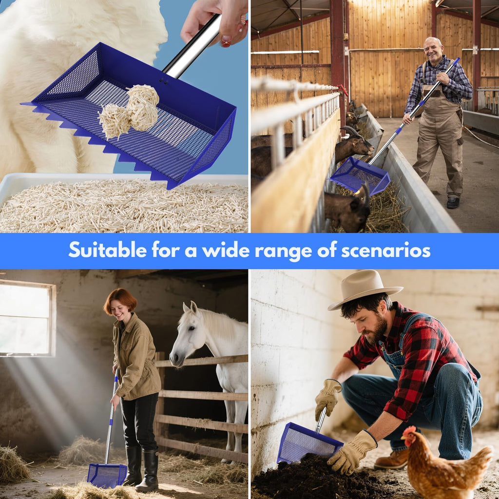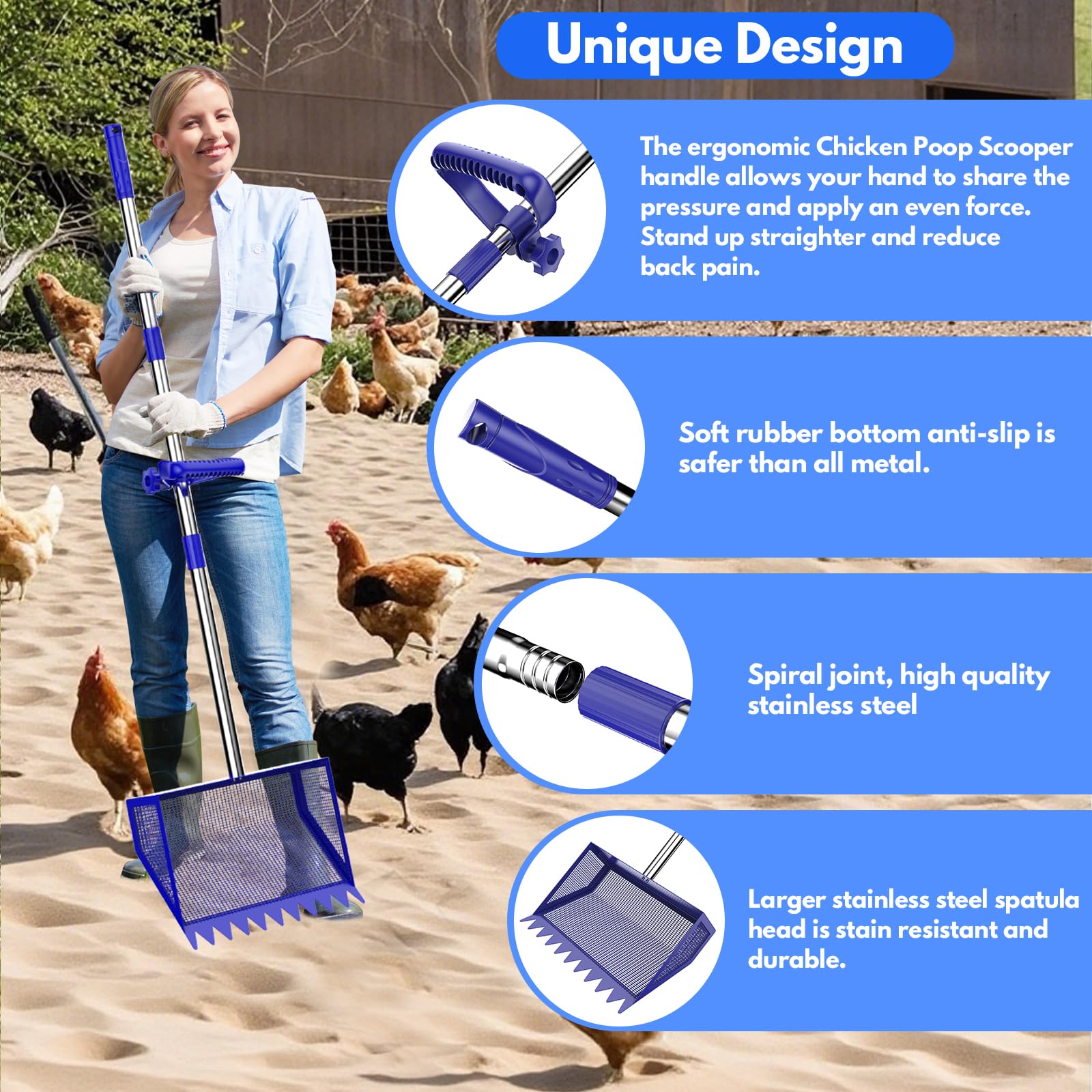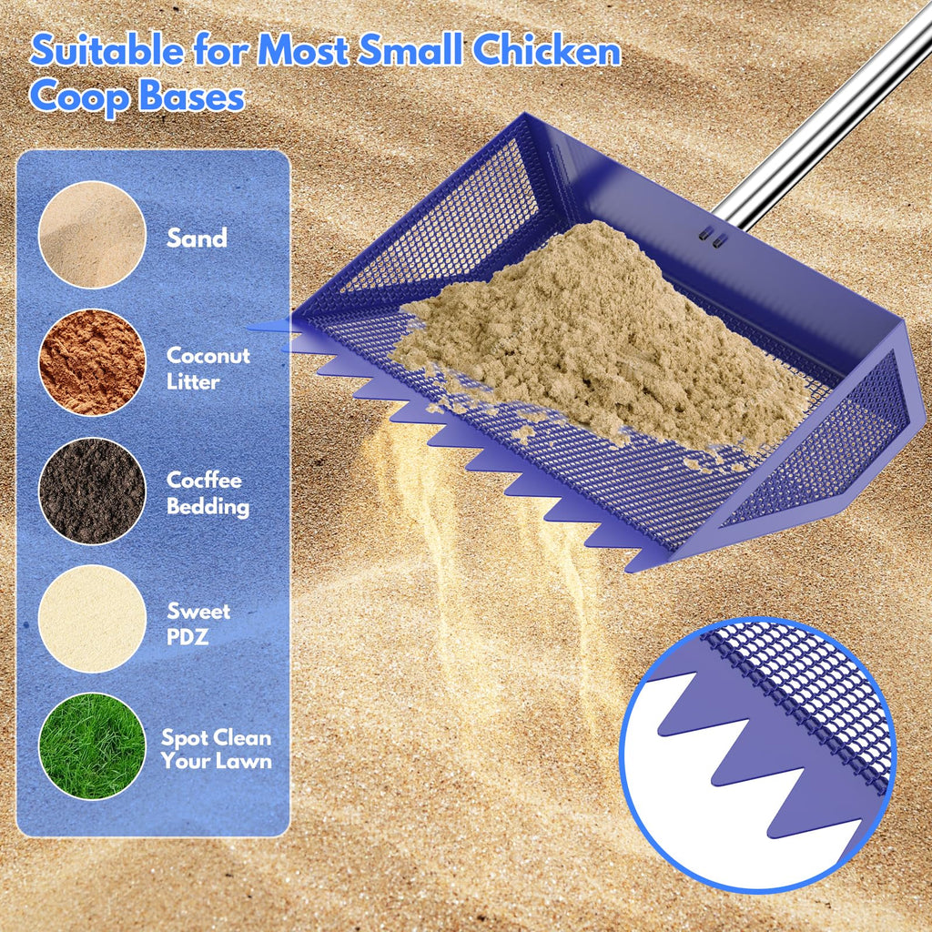 Multi-Purpose Chicken Poop Scooper: This tool goes beyond the chicken coop. It doubles as a cat litter scooper, beach shovel, or livestock pen cleaner, and features integrated rake teeth for faster manure removal. A 0.3-foot gap in the shovel base lets you screen debris for cleaner results.