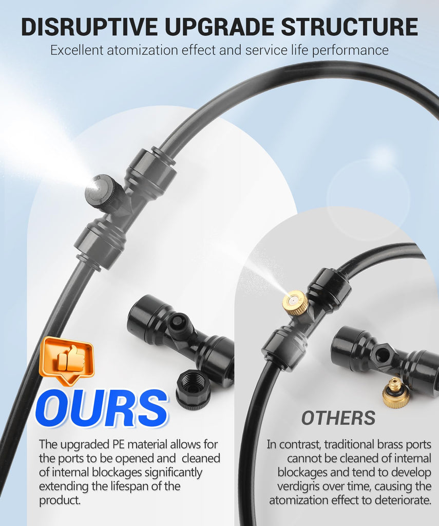 Upgraded PE Integrated Misting Nozzles: Pre-installed nozzles eliminate the need for assembly. The design resists clogging from dirt or sand and ensures consistent mist coverage across larger areas than traditional systems.