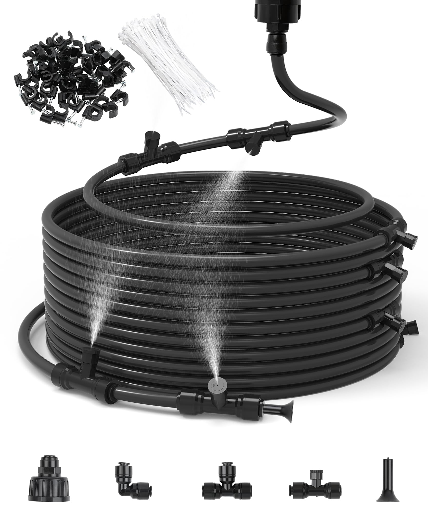 Easy to Use & DIY: Kit includes 125FT of misting line, 45 T-shaped mist nozzles, 4 T-shaped adapters, 3 3/4" hose adapters, 3 elbows, 5 end plugs, 85 ties, and 65 buckles—everything needed for custom setups.