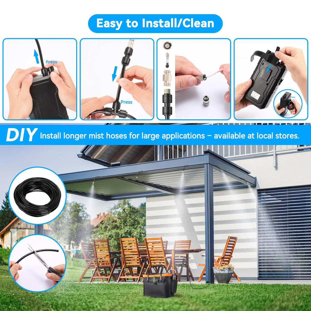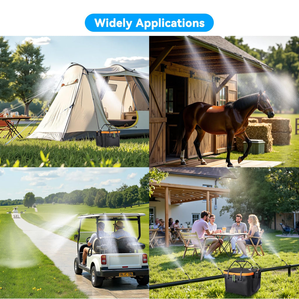 Cooling the Heat – Must-Have Summer Essentials: Produces a fine mist that absorbs ambient heat, lowering temperatures by 5–14°F (3–10°C) and maintaining a refreshing 77°F (25°C). Great for cooling patios, umbrellas, pets, greenhouses, and more.