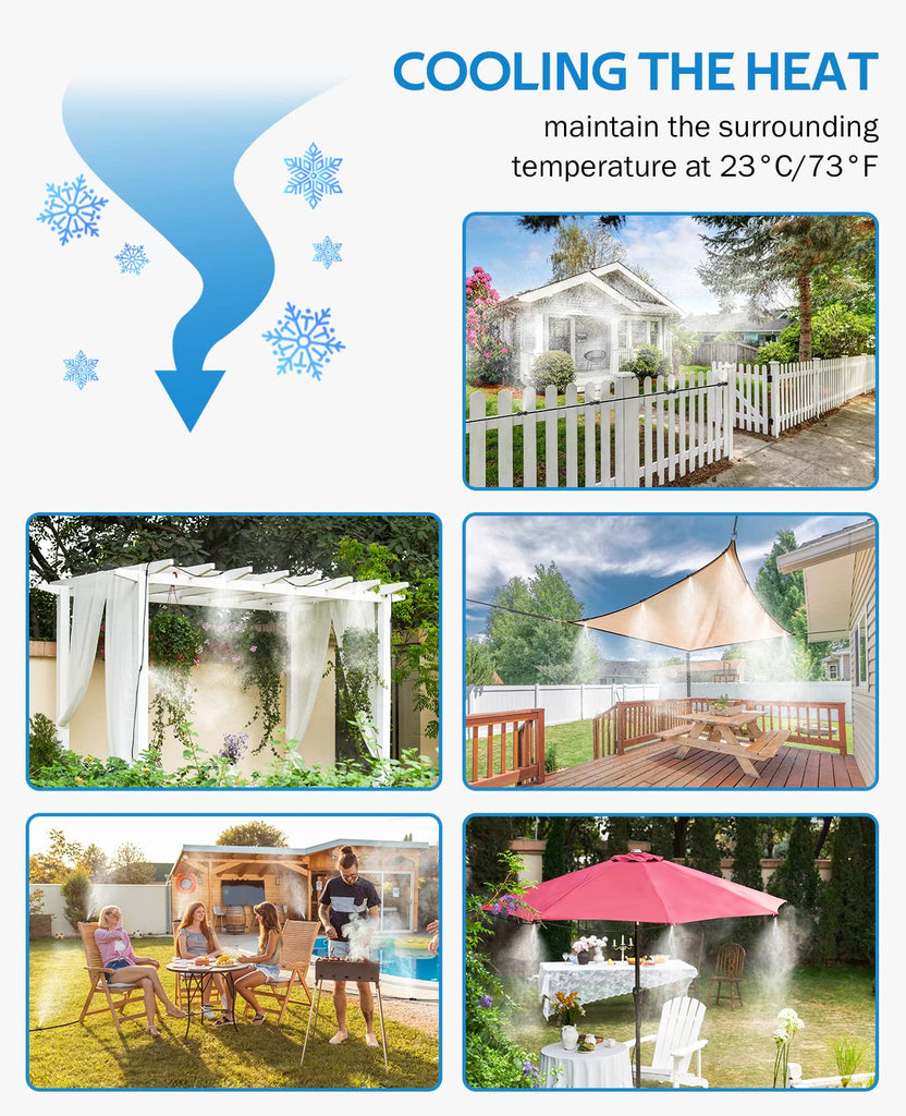 Cooling the Heat: By releasing a fine mist, the system quickly reduces ambient temperatures—bringing the environment down to around 73°F (23°C) for cool, refreshing relief.