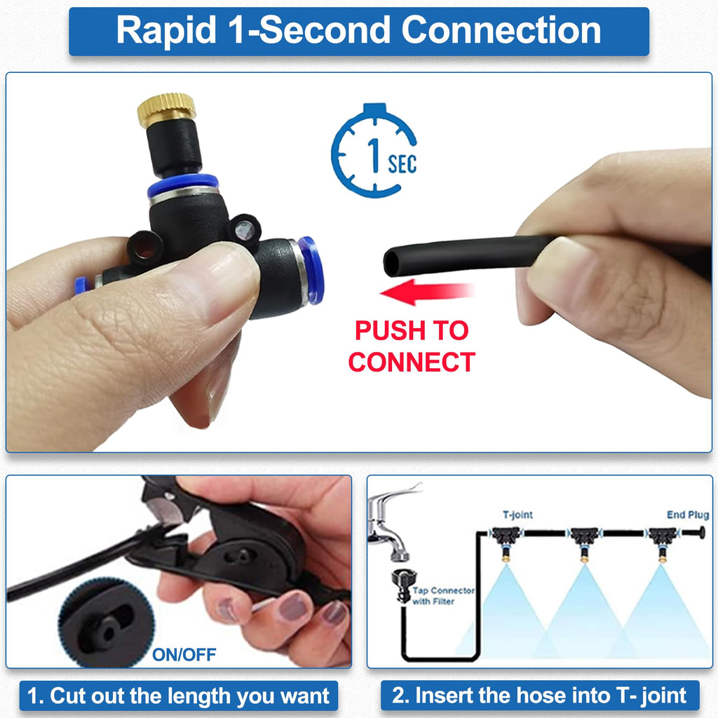 Easy to Install - Rapid 1-Second Push-to-Connect Fittings: No glue or complex parts needed. Just push the tubing into the fittings for a secure, leak-proof seal, and use the included saddle clamps and zip ties to mount it anywhere—fences, ceilings, railings, or string lights.