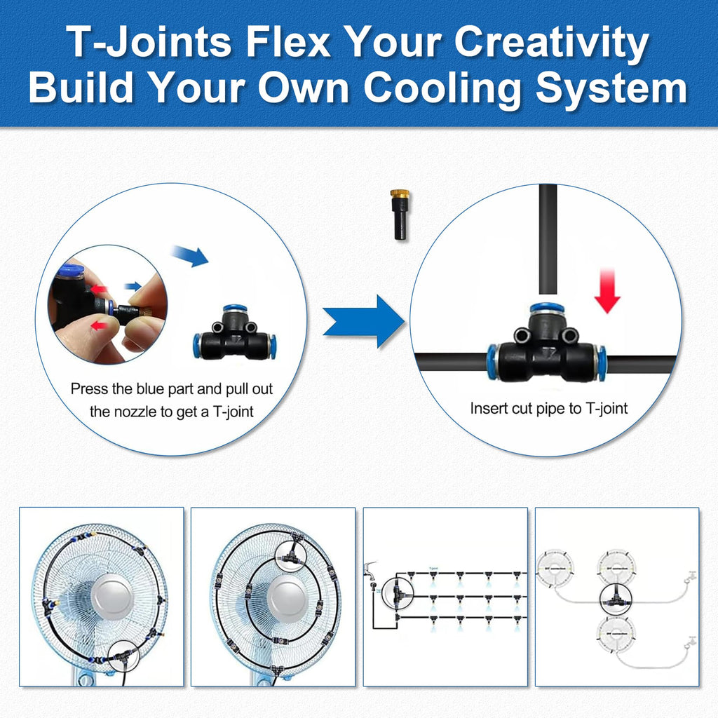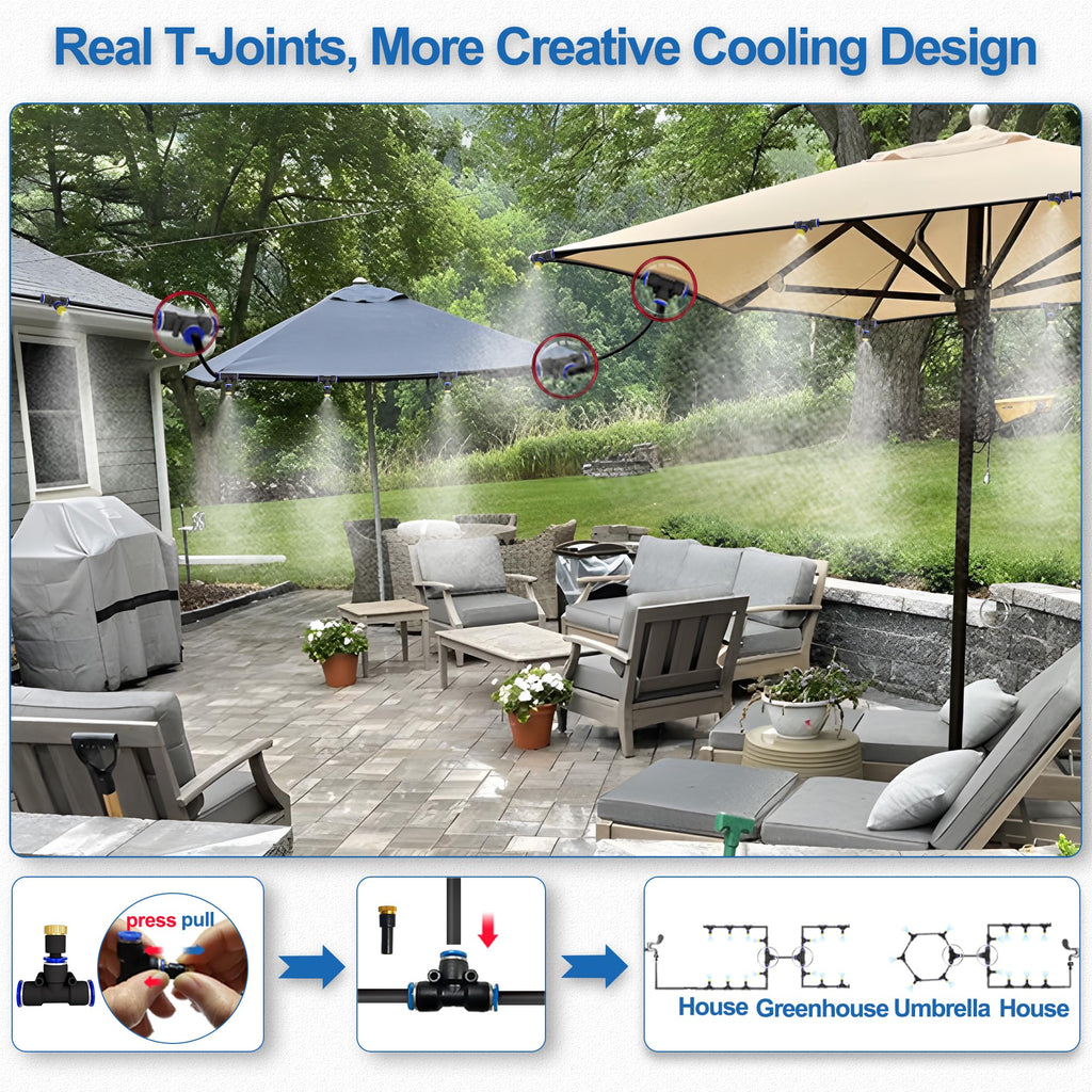 Flexible T-Joints = More Creative Cooling Design for Your Home: Unlike traditional 2-port systems, this setup includes triple-port T-joints that allow you to split lines, extend coverage, and connect to multiple fans or zones. It's perfect for patios, backyards, greenhouses, pergolas, and more.