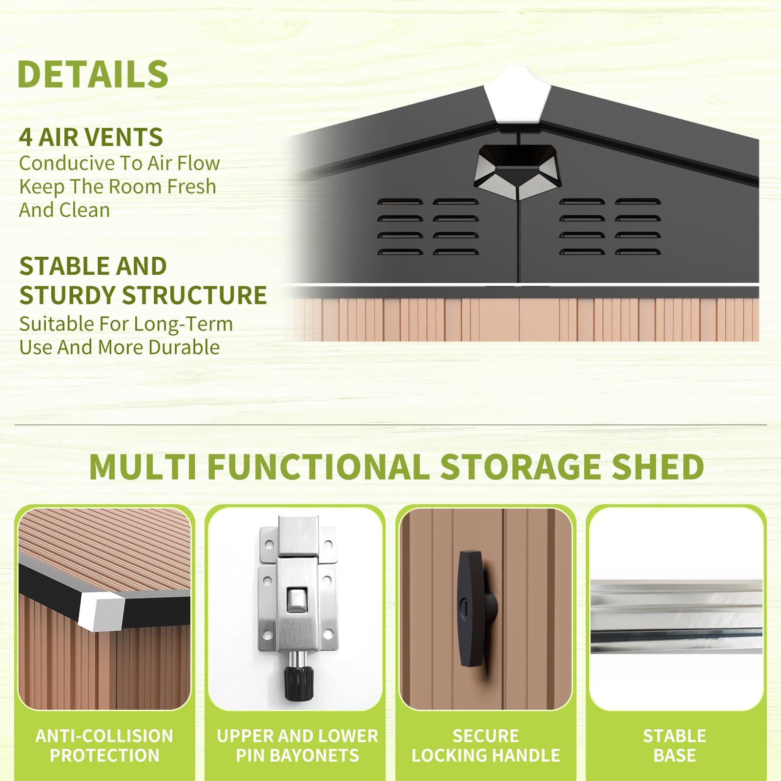 Safe and Durable: Designed with a three-beam roof system, this shed stands strong against wind and snow. It’s built using electro-galvanized steel with a protective paint treatment to resist rust and weather damage, while roof vents ensure airflow and reduce moisture buildup - ideal for year-round use.