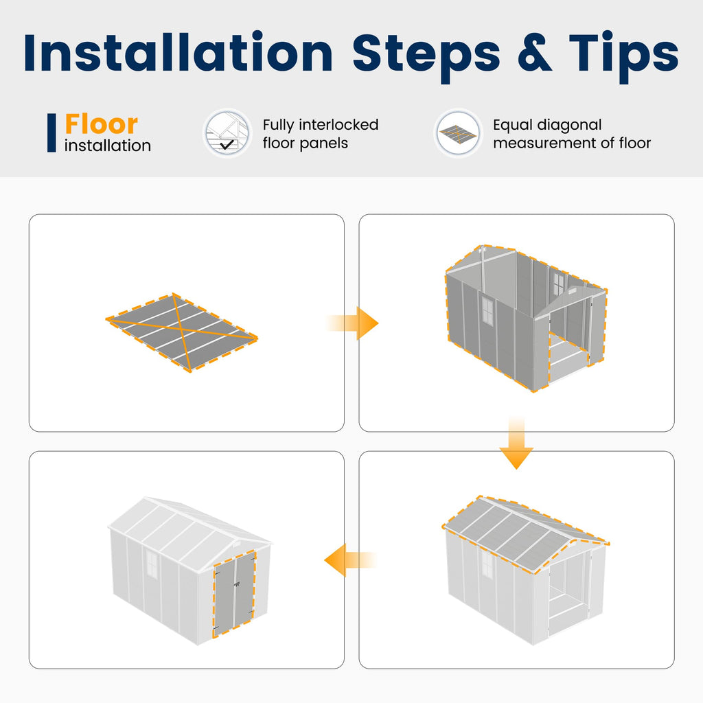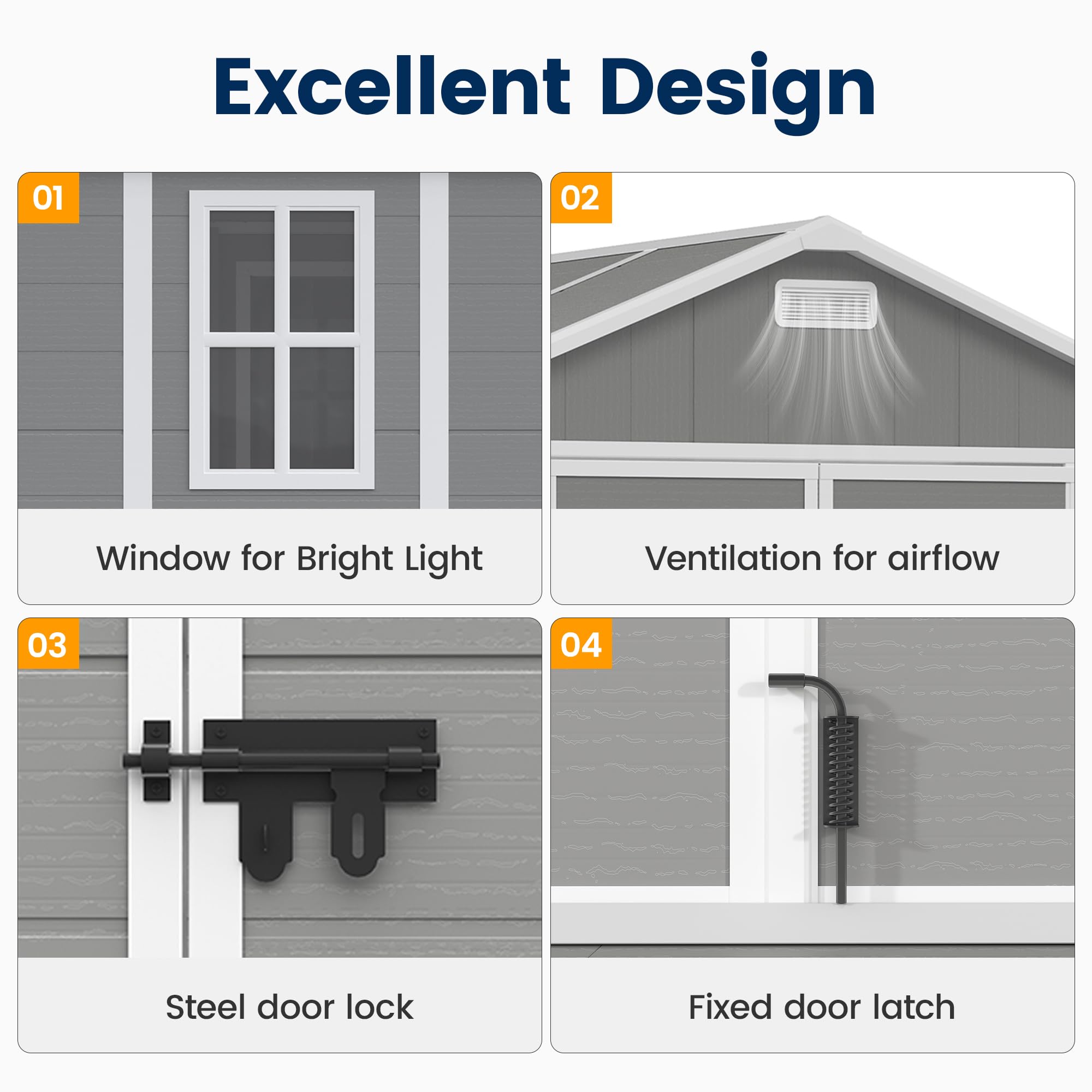 Sturdy Structure: Engineered with a strong frame, this shed offers solid protection against rain, mold, and other outdoor elements. The doors are lockable, providing added security and peace of mind for your belongings.