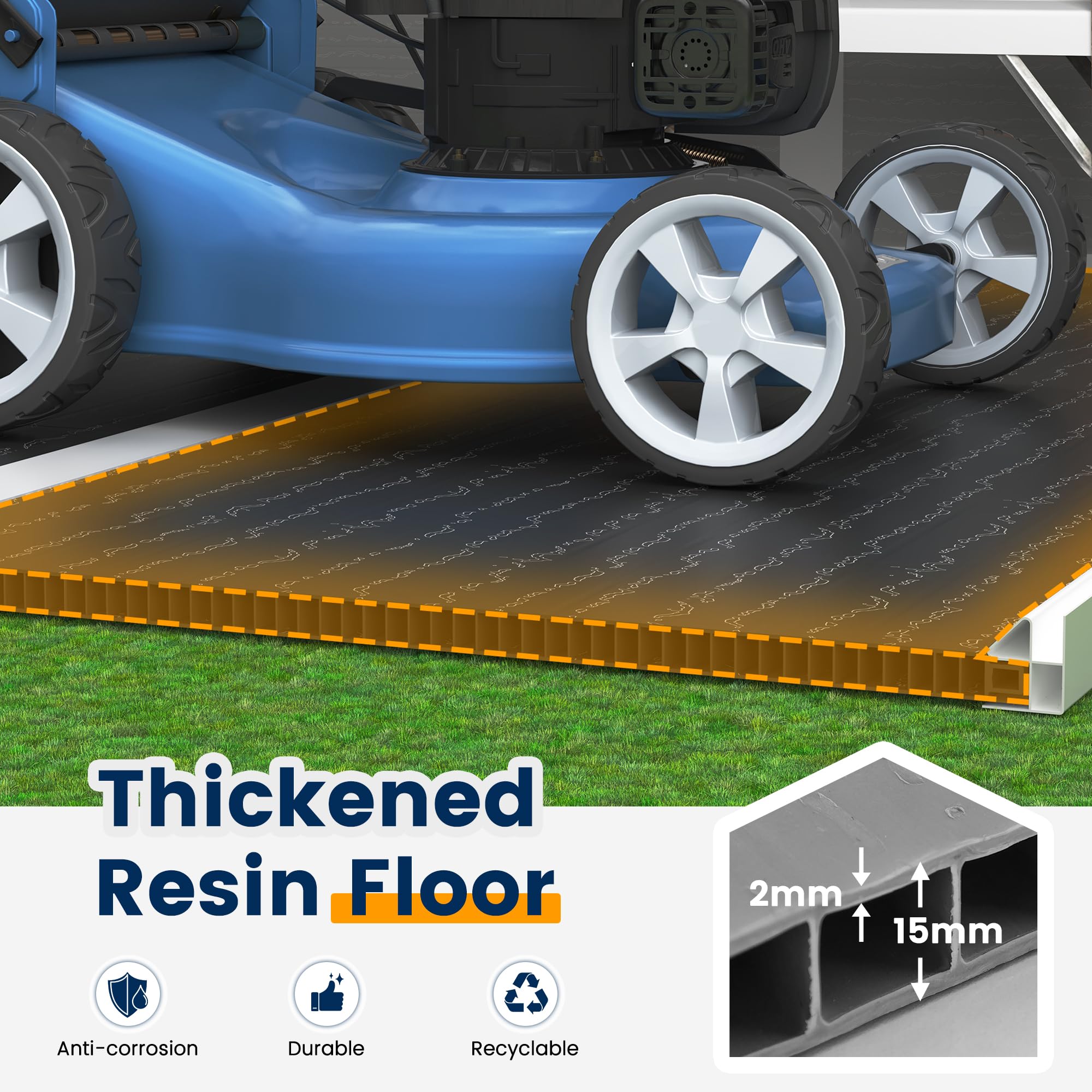 High-Quality Material: Constructed from 12mm thick polypropylene resin plastic, this shed is designed to last. It’s recyclable, corrosion-resistant, waterproof, and rustproof - making it a reliable choice for year-round outdoor use.