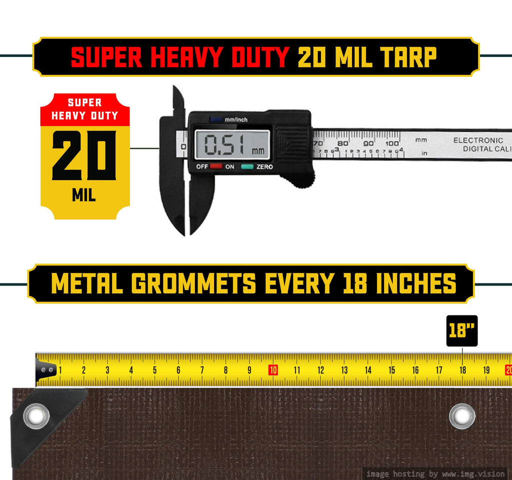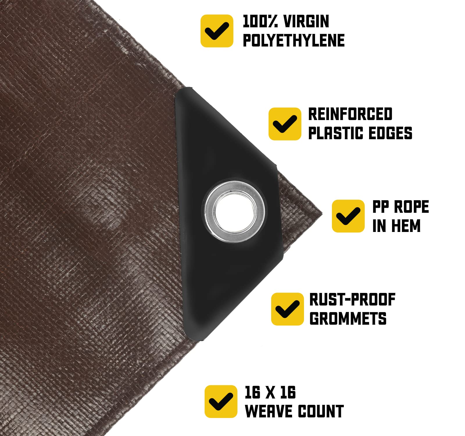 Strong Grommets & Reinforced Edges: Featuring a 16 x 16 weave count and reinforced edges, this tarp includes metal grommets spaced every 18 inches. The combination of tear-resistant material and heavy-duty grommets makes it easy to secure the tarp with rope or bungee cords.
