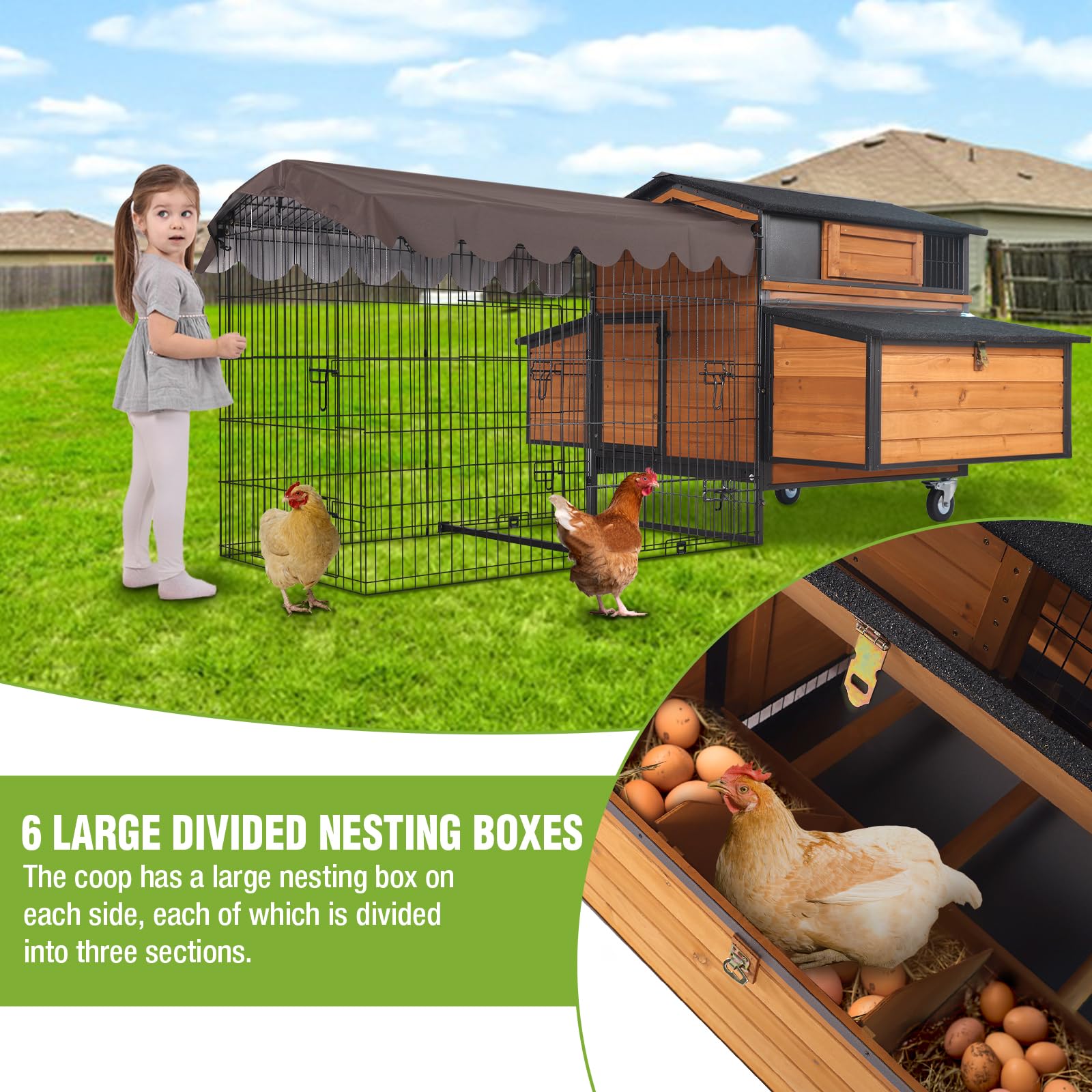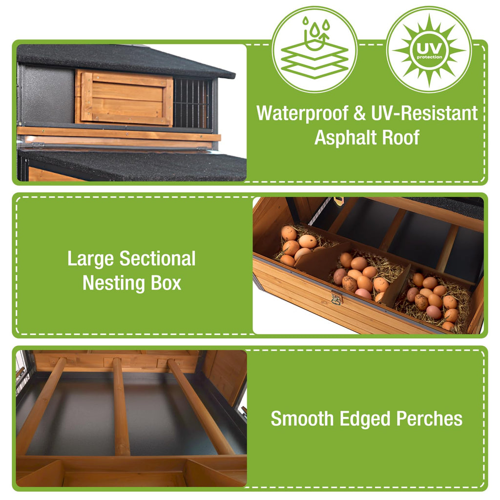 Reinforced Nesting Boxes: Featuring six large nesting sections, the coop supports multiple hens at once. Reinforced metal edges prevent sagging or cracking for long-lasting reliability.