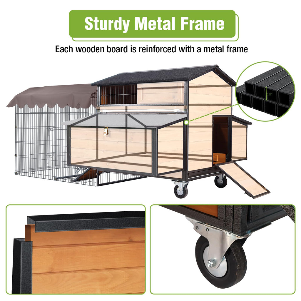 Durable Metal Frame: Built with a full metal frame and fir wood, this coop delivers strength, stability, and weather resistance. It ensures chickens remain safe and secure throughout the year.