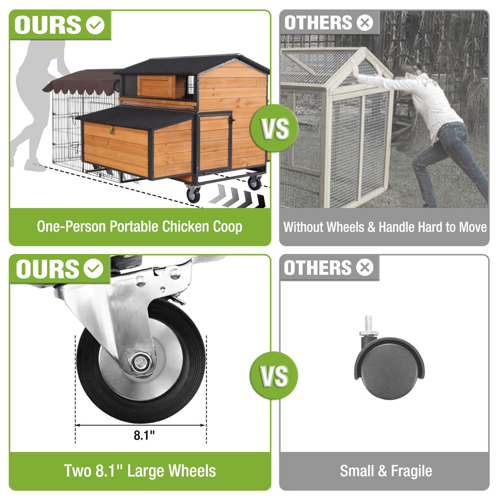 Large Metal Frame Wheels: Two oversized wheels make it easy to move the coop across yards or fields. This mobility allows fresh placement without harming grass or soil.