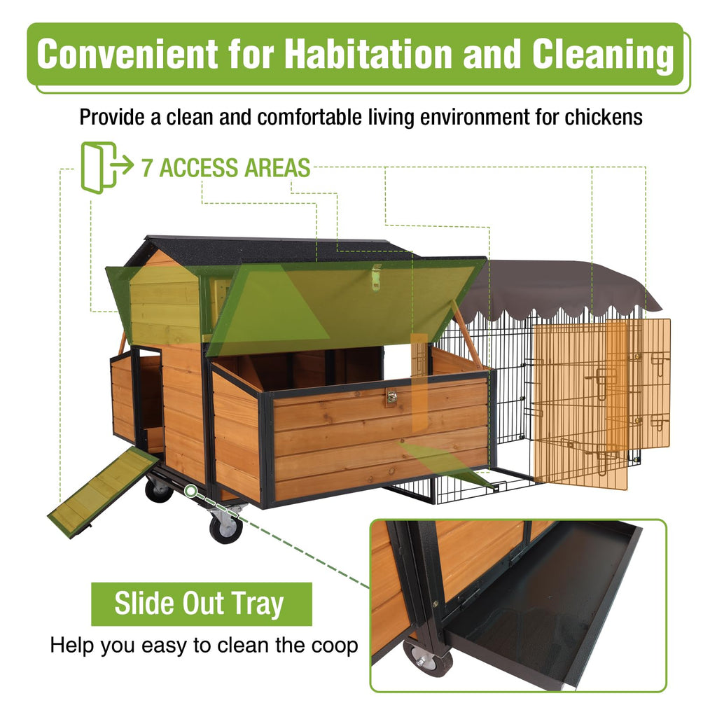 Weatherproof Design: With a metal run covered by a tarp and a waterproof asphalt roof, the coop stands up to rain, snow, UV rays, and predators. It is built for year-round outdoor use in any climate.