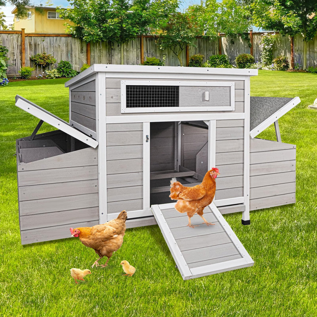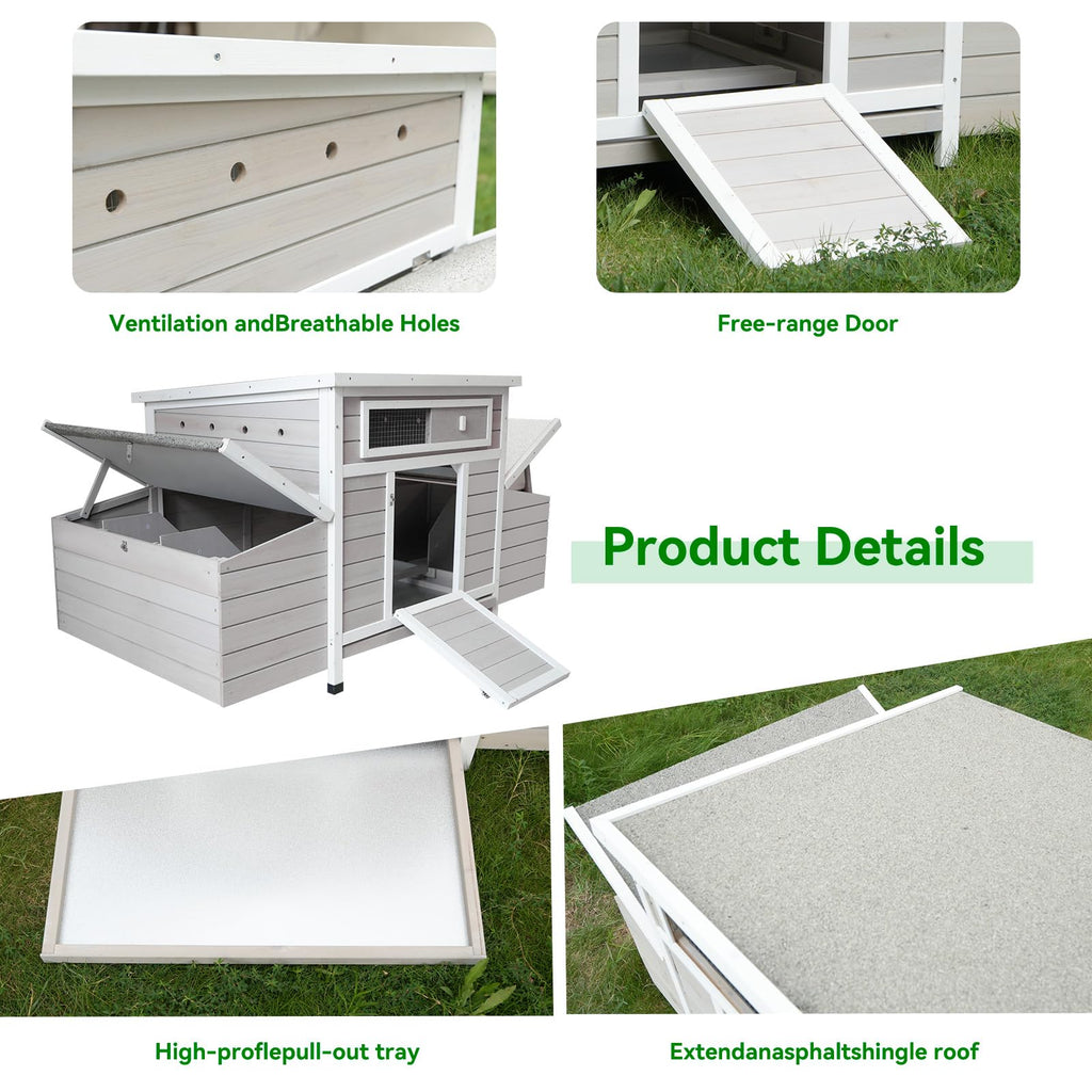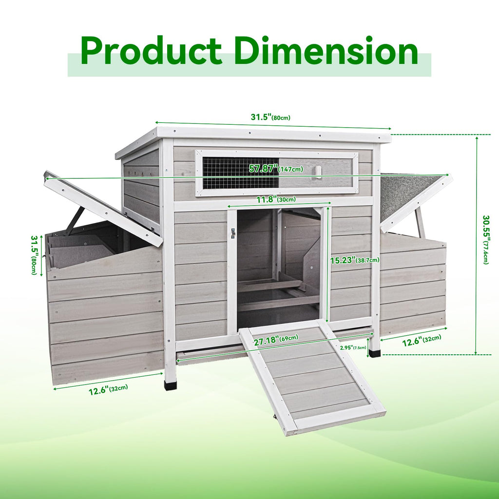Upgrade Large Size Chicken Coop: Measuring 57.87"L x 33.86"W x 30.55"H, this coop features a spacious lounge, six wide nest boxes, and a ramp for easy access. Sliding doors allow smooth entry into the feeding area, giving chickens room to move and rest comfortably.