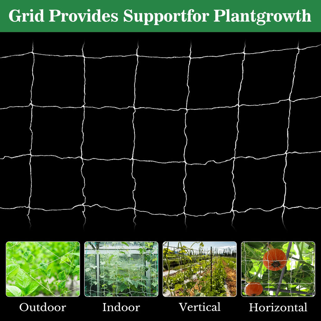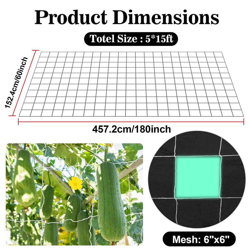 Mesh Structure: Measures 5 x 15 ft with 6 x 6 inch mesh squares, offering a stable grid that can be used horizontally or vertically depending on plant growth.