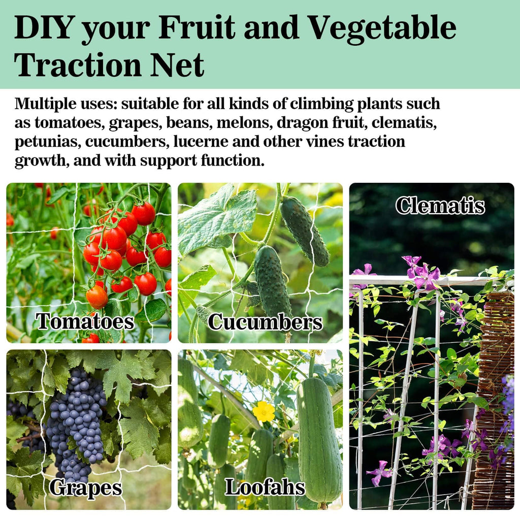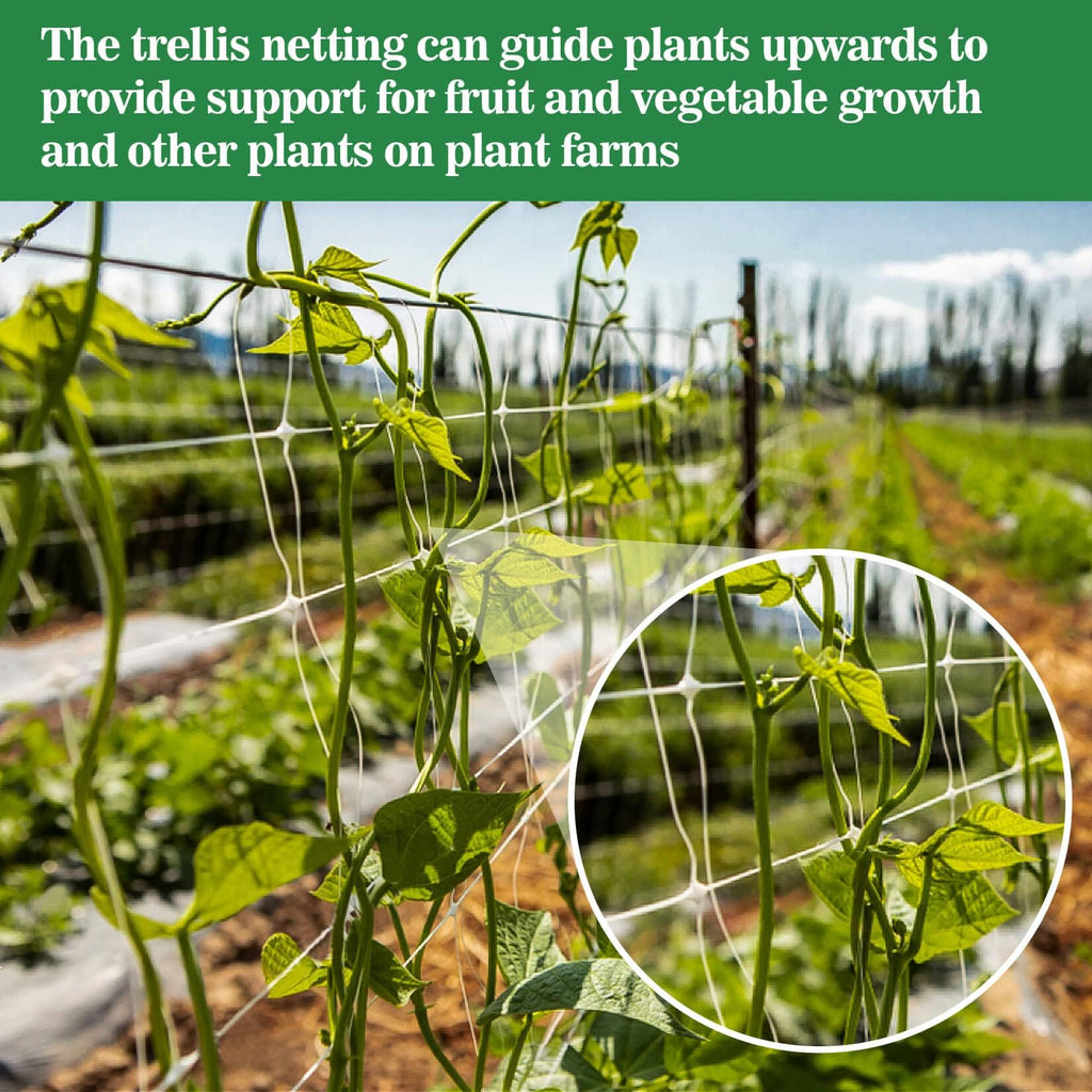 Garden Trellis Netting Uses: Ideal for tomatoes, cucumbers, beans, eggplants, and other climbing plants. Attach to frames or posts for upward plant support.